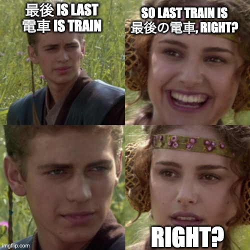 For example, when I want to say “last train,” I immediately think of combining “last” and “train”. Both have direct translations in Japanese: 最後 (last – saigo) and 電車 (train – densha). So logically it should be 最後の電車
